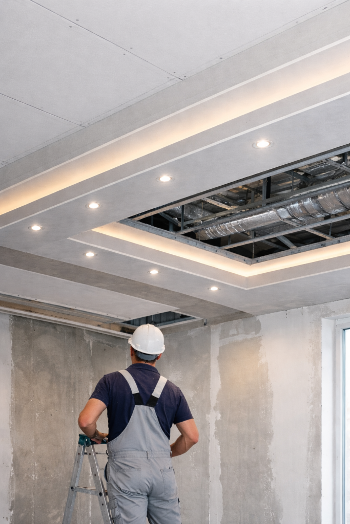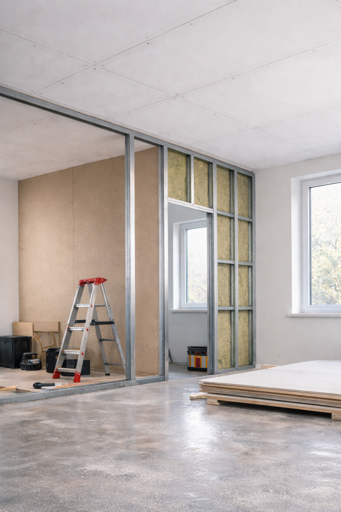 Qualität im Trockenbau beginnt bei der Planung und endet im Detail. Wir bieten Ihnen maßgeschneiderte Trockenbaulösungen für Wohn- und Gewerbeobjekte – von Trennwänden über Deckenabhängungen bis hin zu Schallschutz- und Brandschutzsystemen.
